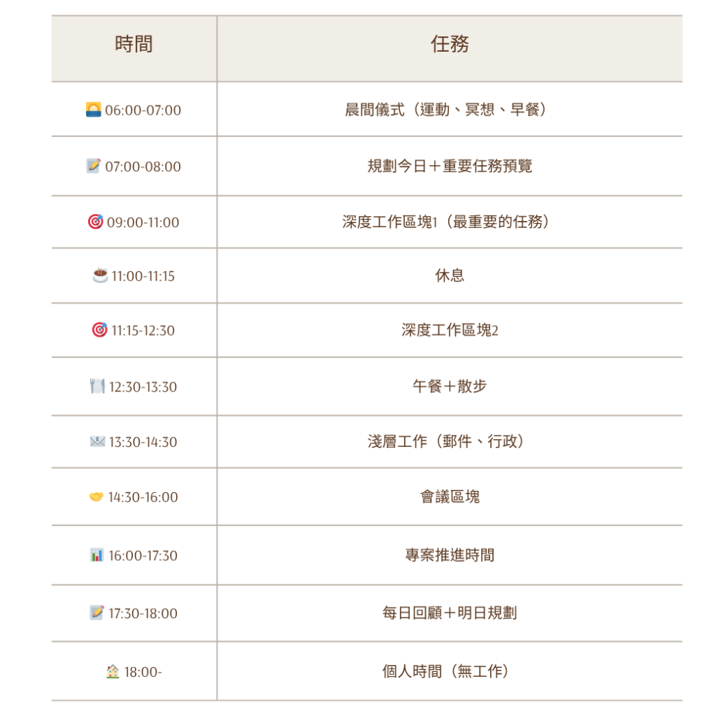 - 🎯 深度工作:需要高度專注(寫作、編程、分析)